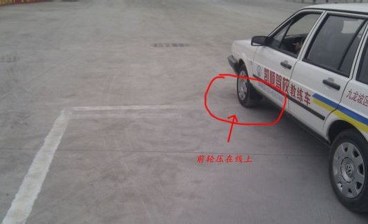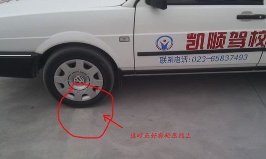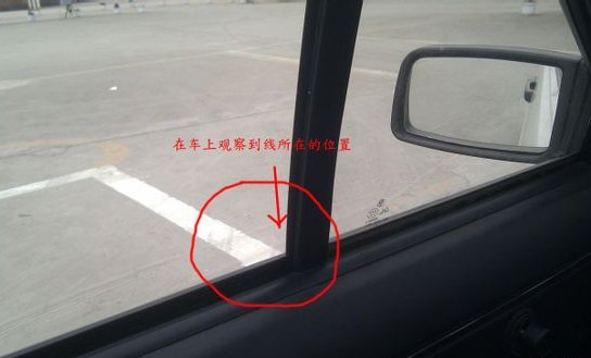 在车上观察,线在左窗立柱时停车,正好车轮压在线上