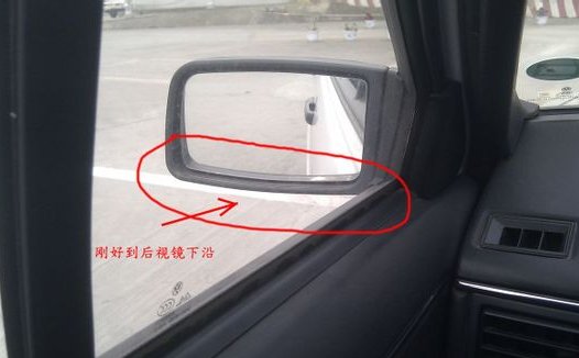 直退时刚好看到线在左后视镜下沿,也可以看右后窗窗花和库线重叠(两点任选一点看)