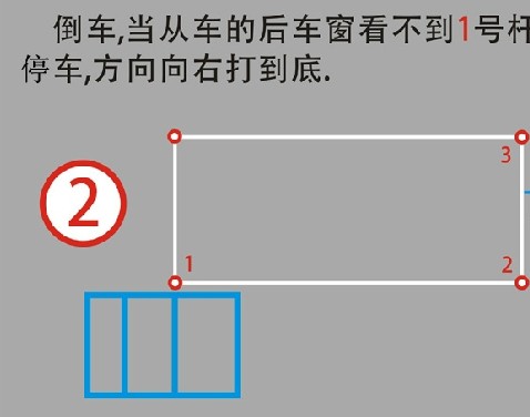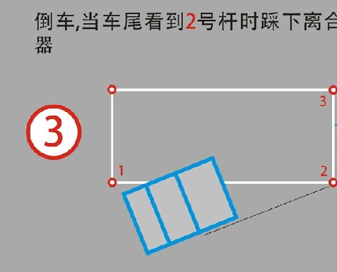 3、做完这些,把头扭向左后方,松开刹车,然后再慢慢的松开离合器,让车辆缓慢的往后退,当看到3号标杆出现在左侧三角车窗竖框并离开了这个竖框10公分左右就迅速的把方向盘向左打死。