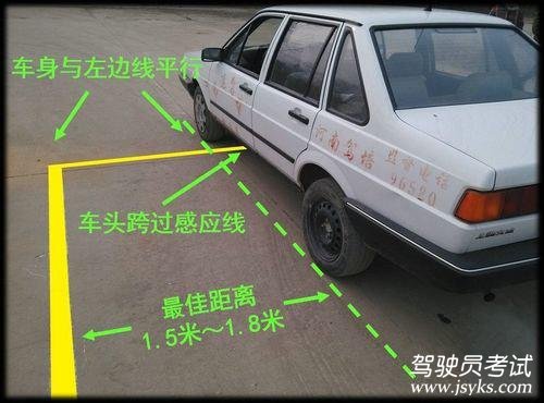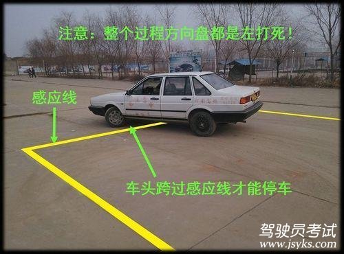 当车身与左边线平行时,回正方向盘,继续前行,车头跨越感应线。此时车身与左边线距离恰巧在最佳距离以内,这样才能保证后面的入库不会轧线。