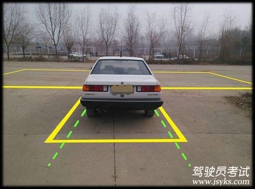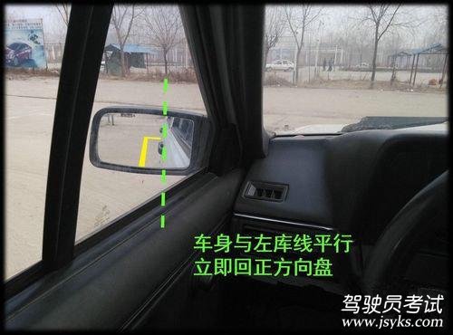 注意:在这个过程中,车速一定要慢,不要看左后视镜,始终观测右后视镜,适时修正车身与库线距离。修正方法要牢记,距离宽了向右稍打方向盘,反之则向左。休正时间不要过长,否则将影响下一步。
