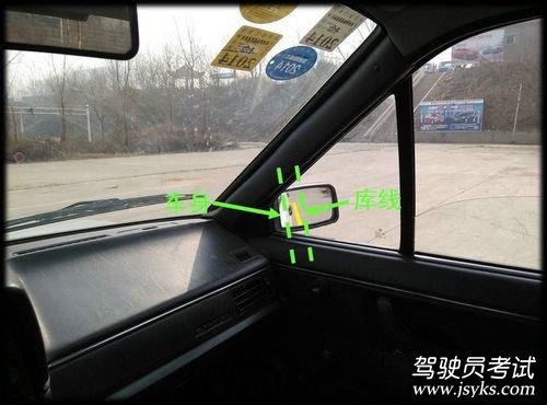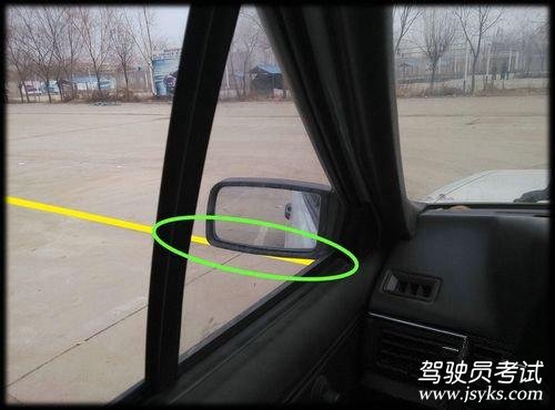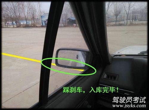 继续缓慢倒车,迅速扭头看左后视镜,当左后视镜下沿刚好盖住左出库线时,踩刹车,停住。这个位置停车能保证汽车在库中的前后距离刚好合适。不过,还是因为身高和座椅的不同,这个停车点也会略有不同,大家可根据外部观察确定是否提前或延迟刹车,但一定要记清修正后的观测点!