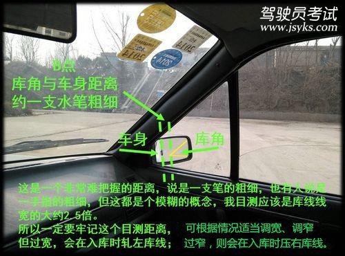 注意:当库角与车身距离相当于一支水笔的粗细时,到达第二个关键点,记为B点,此时迅速回正方向盘。
