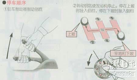 要记住停车的正确操作顺序。停车时如果驻车制动器(手刹)制动力小,有时车会溜车。因此,驻车制动时一定要用力拉驻车制动杆直到听到“咯咯”声音为止。