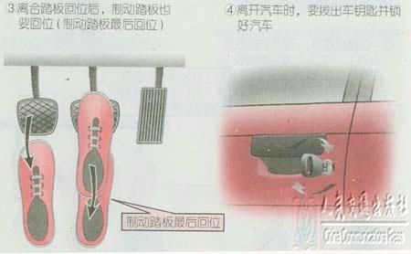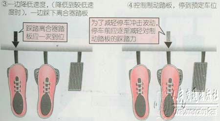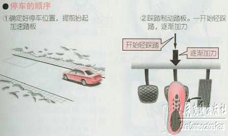 停车时,应早一点收起加速踏板。制动踏板的踩踏方法是:开时轻轻踩踏,慢慢加力,在停止之前逐渐减轻踩踏。