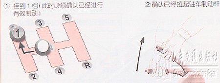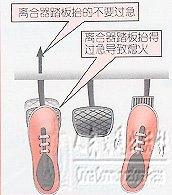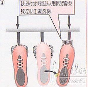 右脚制动踏板快速地移到加速踏板(这时稍稍用力踩踏加速踏板)。车辆起动后,半离合状态下的离合器踏板轻轻回位。