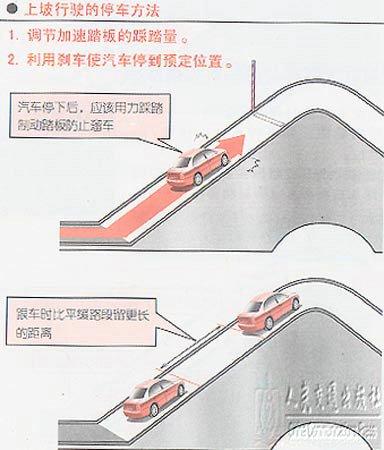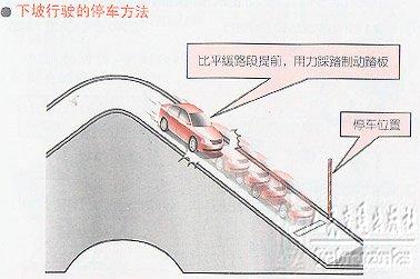 汽车上坡行驶时,由于坡度阻力车速自然会降下来,与平缓路段相比较只需轻轻制动。停车后用力踩踏制动踏板,防止汽车向后滑行。