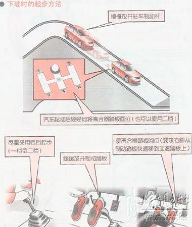 下坡时起步不是什么难题。利用下坡的坡度慢慢放开驻车制动杆,汽车就开始起步了。起步后选择适当速度的档位,轻轻地将离合器踏板回位。